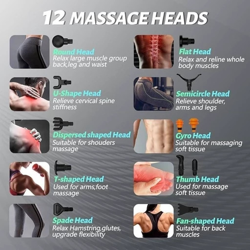 سرهای ماساژ و کاربرد هرکدام: 1. Round Head (سر گرد): • مناسب برای عضلات بزرگ مانند کمر، ران و باسن • ایدهآل برای ریلکس کردن پس از ورزشهای سنگین 2. Flat Head (سر تخت): • ماساژ عمومی کل بدن • مناسب برای ریلکس کردن و کاهش تنش عضلانی 3. U-shaped Head (سر U شکل): • تمرکز روی ستون فقرات گردنی • کاهش سفتی و درد ناحیه گردن و شانهها 4. Semicircle Head (سر نیمدایره): • هدفگیری شانهها، بازوها و ساق پا • مناسب برای ریکاوری عضلات پس از تمرین 5. Dispersed Head (سر پراکنده): • ماساژ ملایم ناحیه شانهها و کتف • کاهش گرههای عضلانی 6. Gyro Head (سر چرخشی): • ماساژ بافتهای نرم مانند عضلات کوچک دست و پا • افزایش جریان خون در نواحی حساس 7. T-shaped Head (سر T شکل): • ماساژ کف پا، بازوها و مچ دست • تسکین دردهای موضعی 8. Thumb Head (سر انگشتی): • ماساژ دقیق نقاط حساس و گرههای عضلانی • مناسب برای فیزیوتراپی 9. Spade Head (سر بیلچهای): • تمرکز روی همسترینگ و عضلات باسن • بهبود انعطافپذیری و کاهش خشکی