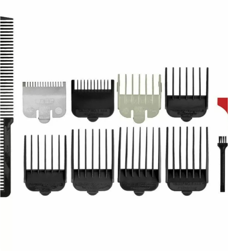 - شانههای راهنما (Attachment Combs) — همراه دستگاه شانههای مختلفی عرضه میشوند (مثلاً 1.5 / 3 / 4.5 / 6 / 10 / 13 / 19 / 25 میلیمتر)، بنابراین میتوانی طول موها را طبق سلیقهی خودت تنظیم کنی.